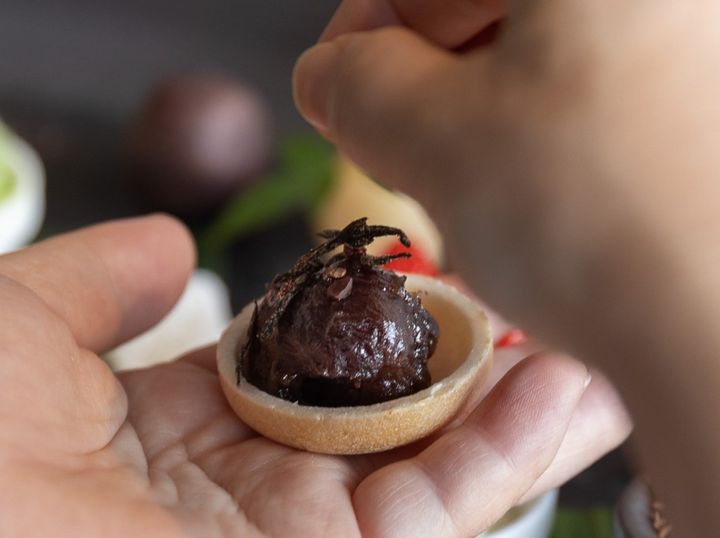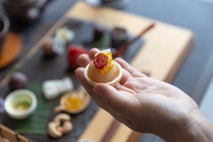 まず試してみたのは、白あんにジャムとドライトマト。甘さ控えめのあんこに柑橘のさわやかな酸味とうま味を凝縮したドライトマトの果肉感が加わり、絶妙です。今まで試したことのない食べ合わせですが、おいしい発見。