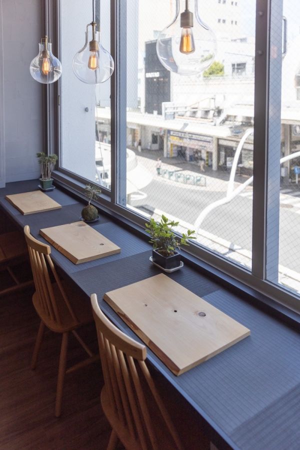 3階と4階は、窓に面してカウンター席があり、おひとりさまにもやさしい店づくり。注目して欲しいのが机の天板です。カウンター席もテーブル席も、その天面には畳が張られていて、その上に無垢板を敷いてメニューを提供するスタイル。和モダンな雰囲気が素敵!窓からは、四条通の賑わいが眺められ、外の喧騒とは対照的なゆったりとした時間を、より濃く感じられます。