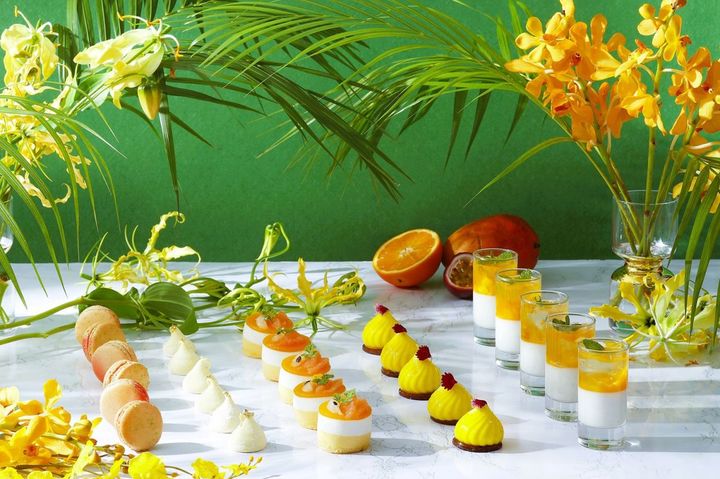スイーツは、レモンの酸味がアクセントになった、パッションマンゴーソースとパンナコッタのマリアージュを楽しめるヴェリーヌ、さわやかな柑橘系のオレンジと相性のよいレモンを組み合わせたレアチーズケーキ、濃厚なマンゴーの甘みとふわふわの食感が楽しいマンゴーギモーヴ、トロピカルフルーツとココナッツをベースにし、みずみずしいグレープフルーツとさわやかなライチの果肉がエキゾチックさを引き立てるムースがラインアップ。
