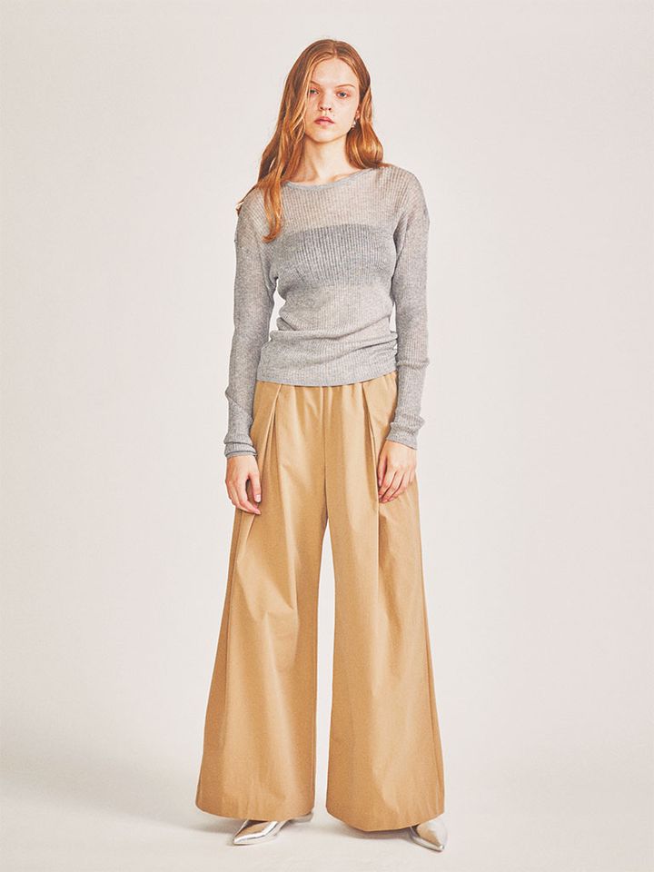レーヨンとポリステルの糸を混ぜた、シャリ感と透け感のある生地。さりげなく光を反射する質感が冷たいグレーの色みと相まって、「夏でニット」もほっこり見えずシャープな表情に。ニュアンスを生む計算がつまった素材感に、くしゅっとたるむ長めのそでが単調にとどまらない奥行きをメイク。