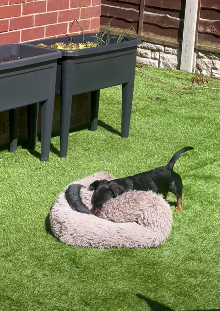 ベッドをお庭に運ぶダックスフンドは、こちらの動画からご覧いただけます。