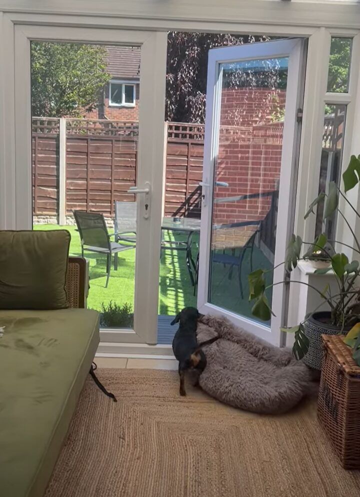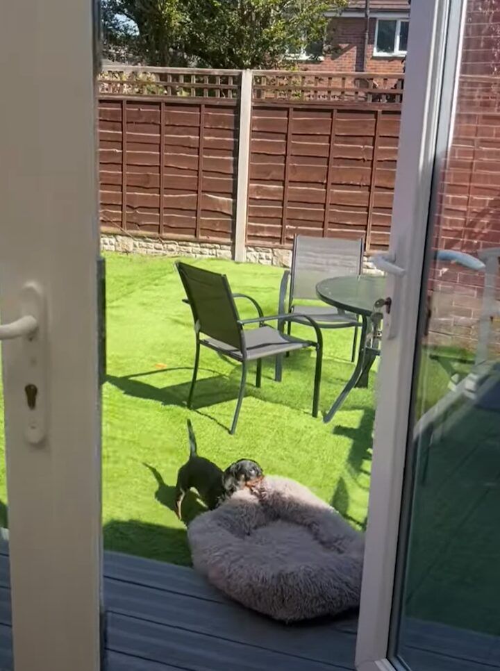 ベッドを運びながら、外に出てしまったダックスフンド。