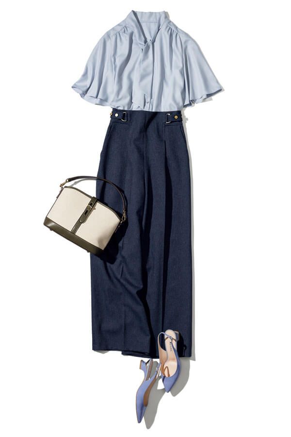 サックスのブラウスとインディゴのパンツで、濃淡しっかりのメリハリあるワントーンに。 垂らしたボウタイとパンツのセンタープレスが目線を縦に促し、スタイルアップ効果も♪