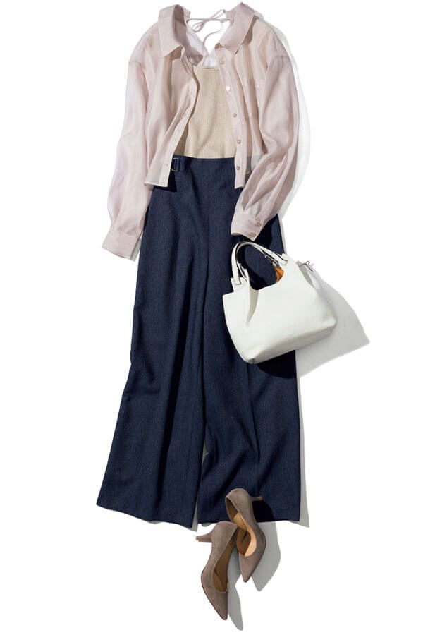 シャツは前を開けて抜け感を出すと、きれいめなワイドパンツとの合わせがコンサバに転ばずこなれ見え♪ シャツの後ろ姿を彩るきゃしゃなリボンで、可愛げも抜かりなく。