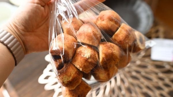 バームクーヘンの切落しは、一口サイズものが袋いっぱいに入っていましたよ。端っこの部分は少し固めの部分もありますが、その食感もクセになるサクサク感がたまりません。一口サイズなのでついつい食べ過ぎてしまう軽さもあるので、食べ過ぎ注意ですよ。