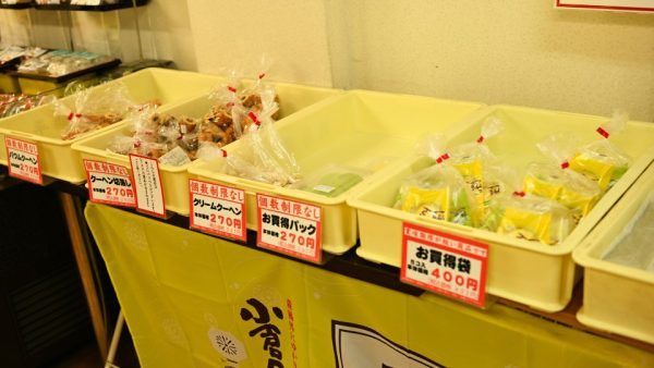 ぽんつくに惚れ込んだ私の目に飛び込んだのはアウトレット品の数々!この日は、お買得パックという商品が売られており、4つのぽんつくが入ったものがおトクな価格で販売されていました。賞味期限が近い色々な味が入ったぽんつくや、バームクーヘンの切れ端がぎっしり詰まったものなどたくさん販売されていましたよ。 店員さんにいつも買うものは?とうかがったところ「アウトレット品をよく買いますよ。」とおっしゃっていました。店員さんもついつい買ってしまうオトクなアウトレット品。見逃せません!