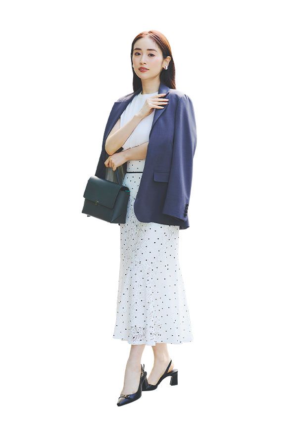 白レースにドットを浮かべた個性派デザインも魅力的。落ち着いたマーメイドラインも通勤シーンにしっくりマッチ! ジャケットで社会性もクリア。