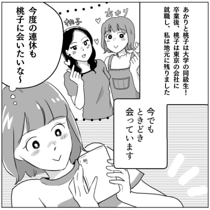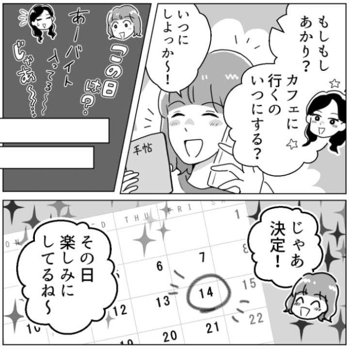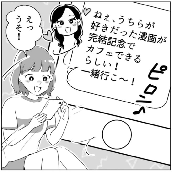 久しぶりに大学時代の友達と遊ぶ約束をした主人公。好きだった漫画のコラボ記念カフェがあるということで、お互い当日を楽しみにしている様子です。