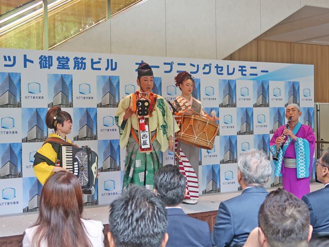 御堂筋沿いの新しいオフィスビルとしてオープンした「アーバンネット御堂筋ビル」。NTT都市開発株式会社が開発した同ビルは、御堂筋エリアの盛り上がりに貢献する新たなスポットとして注目されています。オープニングセレモニーには多くの来賓と、ミャクミャクや、ちんどん通信社による「チンドン屋」パフォーマンスも駆けつけ、盛大に盛りあがりました。