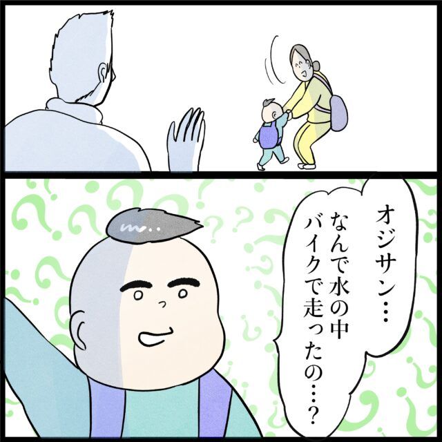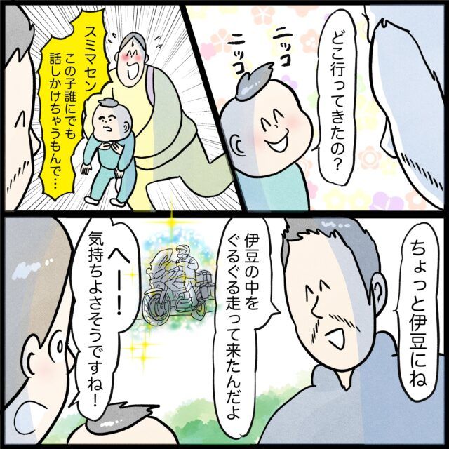 長男レンくん、長女スイちゃん、次男ヨウちゃん、3人のお子さんのママであるはんままさんから、勘違いのお話です。ある日、バイクに乗ったおじさんに「どこ行ってきたの?」と話しかけたヨウちゃん。おじさんが伊豆に行ってきたと聞いたヨウちゃんは、なぜか不思議そうで・・・。