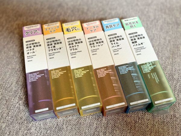 商品名は、その名も「集結!ほぼ植物の原液美容液*シリーズ」。(*化粧品原料として)そのアンプルのようなパッケージもシンプルで分かりやすい、と感じました。6種類全部買って、並べてもかわいいし、その日の肌の状態に合わせて「どれを使おうかなぁ」と選ぶのも楽しそう!