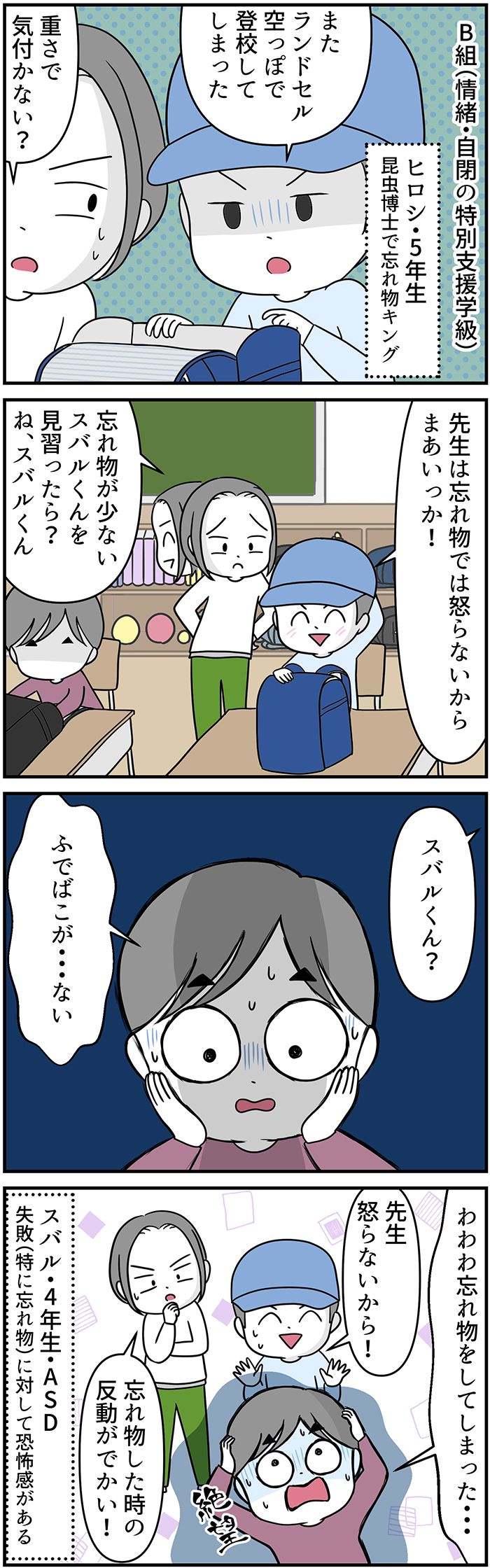 ASD(自閉症スペクトラム)の小学生・スバルくんのカラフルな日常を描きます。今回はスバルくんたちのクラスの忘れ物事情です。