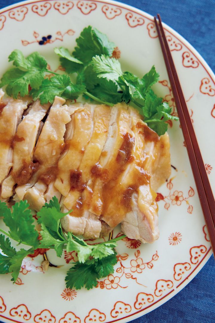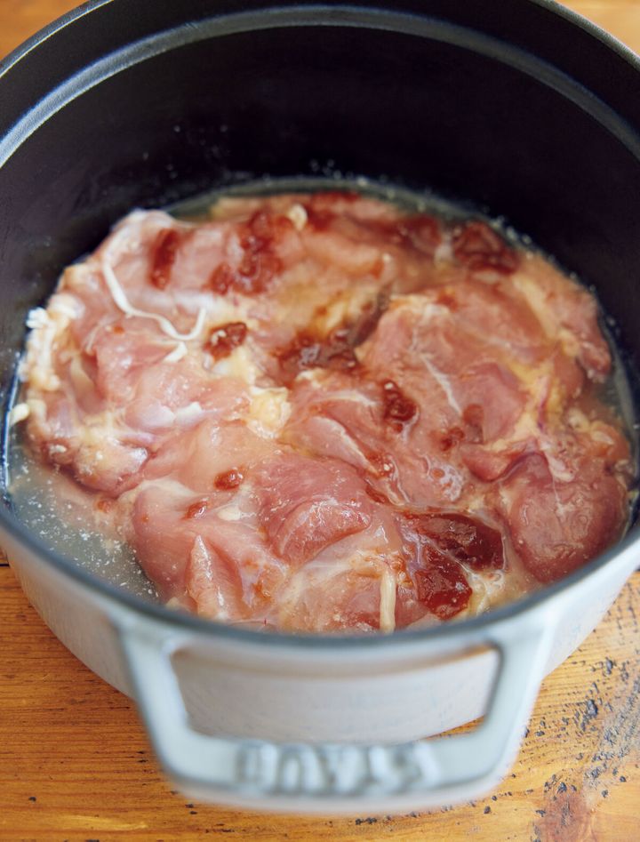 口径約20cmの鍋に米油をひき、鶏肉を皮目を下にして入れ、梅干しをちぎりながら種ごと加える。その他の〈A〉を順に加え、鶏肉になじませる。ふたをし、弱めの中火で8~10分煮る。食べやすく切って器に盛り、あればパクチーを添える。