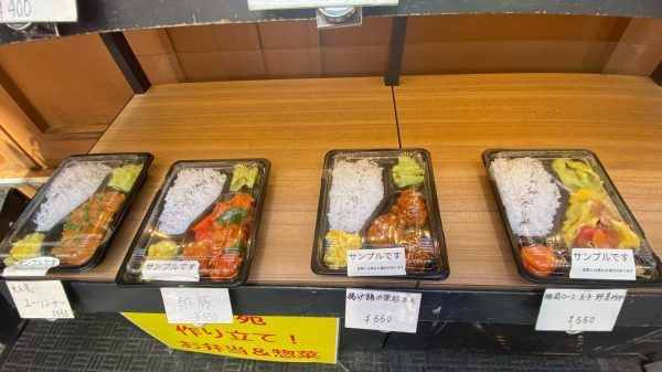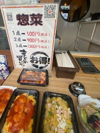 お店入口には、お弁当やお惣菜をテイクアウトコーナーがあります。エビチリ・餃子・春巻き・炒飯等の1品料理や酢豚や揚げ鶏の黒酢等のお弁当(550円)をテイクアウトできます。お惣菜1点500円・2点900円と、まとめ買いがお得とのことですよ。