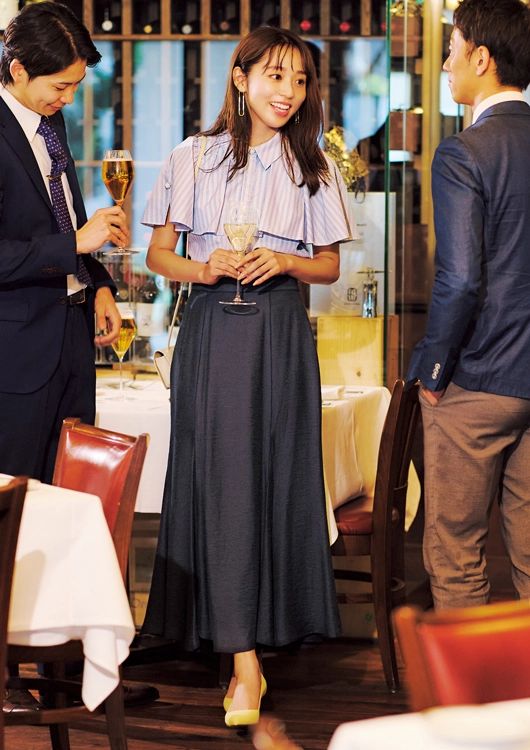 あざとい系ファッションが多い合コンで抜きん出るコーデがこちら。ストライプ×ネイビーで堅実に見せつつ、女らしいシルエットで魅了して。