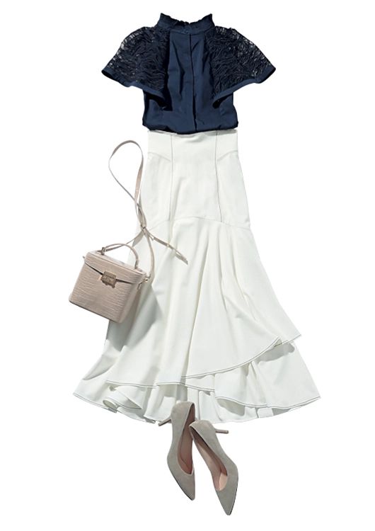 ケープブラウス¥9,790/And Couture(And Couture ルミネ新宿店) スカート¥18,700/Stola. ピアス¥4,950/MEX(ロードス) バッグ¥38,500/メアリ オル ターナ(AL Design Inc.) パンプス¥26,400/銀座かねまつ(銀座かねまつ6丁目本店)