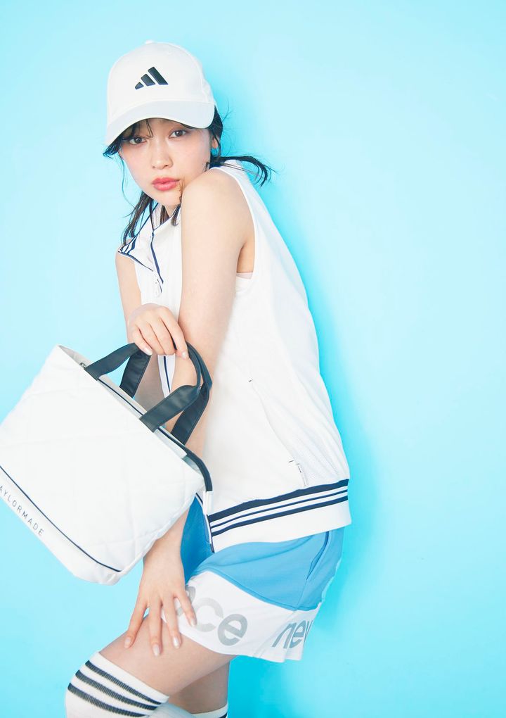 [スカートを着回し]ベスト¥6,999/ティゴラ キャップ¥2,970、ソックス¥2,200/アディダス ポーチ¥9,900/テーラーメイド シューズ¥14,850/ニューバランス ゴルフ