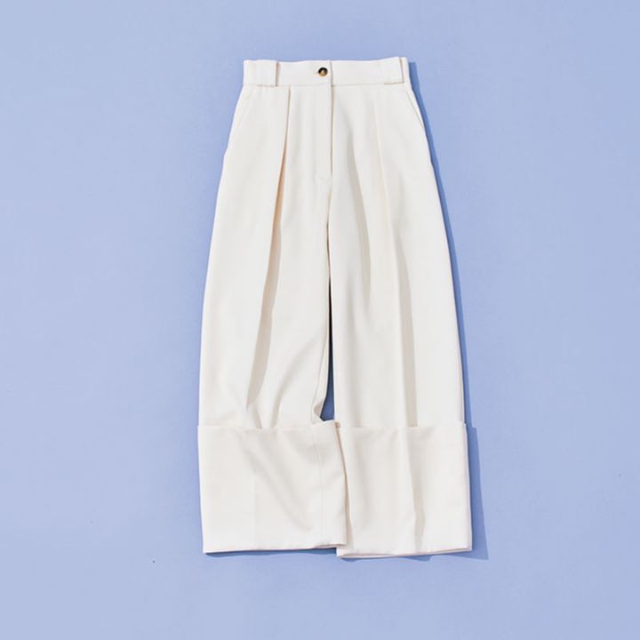 エストネーションからデビューした新ブランドでさっそくゲットしたのは、ぺたんこ靴でもスタイルよく見えるワイドパンツ。迫力が出ないよう、私は淡いエクリュカラーを。ワントーンに合わせるのが気分。(ライター/濱口眞夕子さん)
