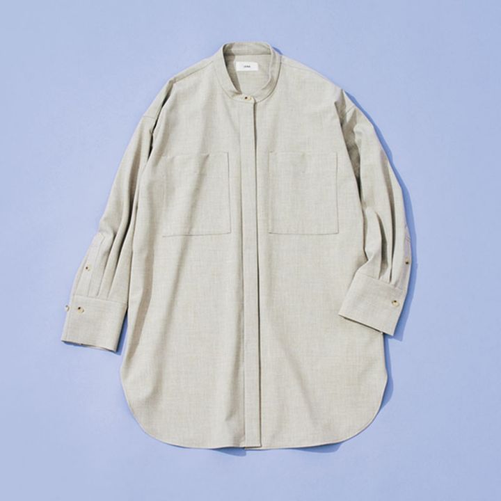 バンドカラー、濃すぎず薄すぎないサンドベージュ、ゆるっとしたシルエット…今の「こんなのが欲しかった!」が詰まったシャツ。長め丈ですがあえてアウトさせて、レイヤード風のコーデで着こなしたいです。(編集/中畑有理さん)
