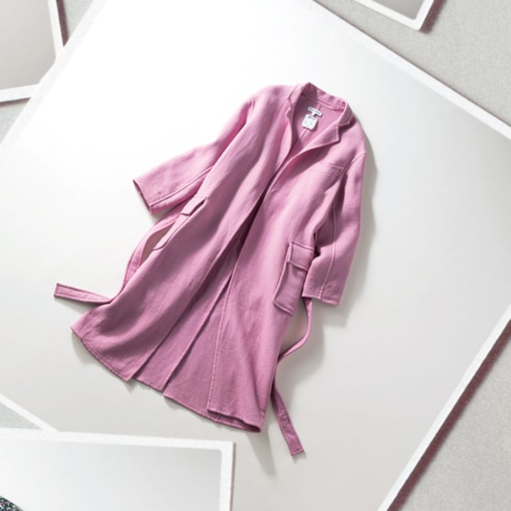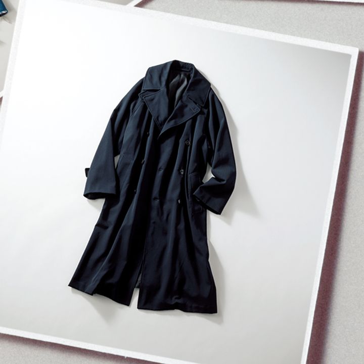 淡いけれど甘さがほどよいピンクがお気に入り。重ね着もしやすい一枚仕立てで、さらりと着てもキレイな形。かっちりしすぎない素材も気に入っています。あえてベルトは締めず、カジュアルに羽織っています。(スタイリスト/三好 彩さん)