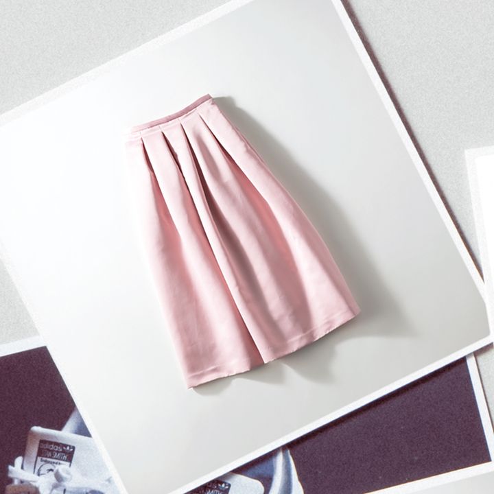 淡いピンクに光沢とハリのある生地なので、手抜き感なくオシャレに見えるんです。そして、なんといっても女子受けがいい! 甘すぎるかな?と心配でしたが、ベーシックカラーのトップスと合わせると程よい甘さなんです。(ライター/北山えいみさん)