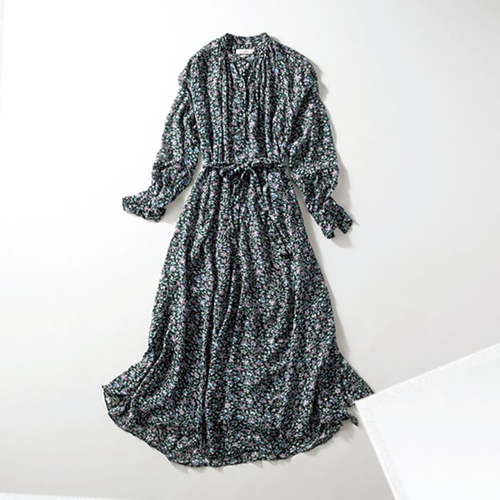 しなやかなシアー素材、無地感覚で気負わず取り入れられる細かいプリント、ヴィンテージっぽいニュアンスも気に入っています。ベルトなしでそのままバサッと着ると気になるボディラインも拾いにくく安心感があるのもいいです。(ライター/西道倫子さん)