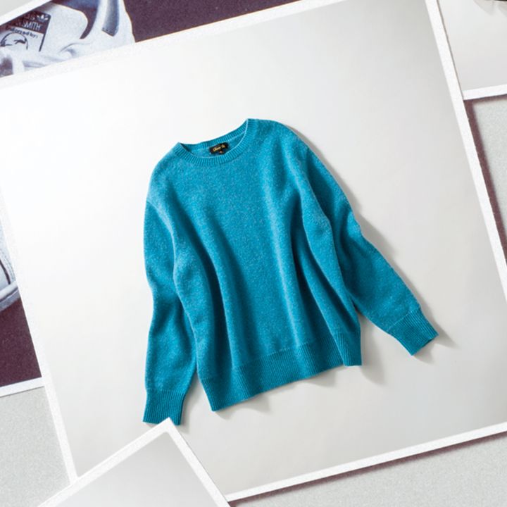 普段派手な色はあまり着ないのですが、この鮮やかでアッシュなブルーには一目惚れ。ざっくりしているのにカジュアルすぎないのが丁度いい。キレイめにも着られるシンプルなデザイン、カシミア100%の手触りのよさも好きです。(スタイリスト/荒木里実さん)