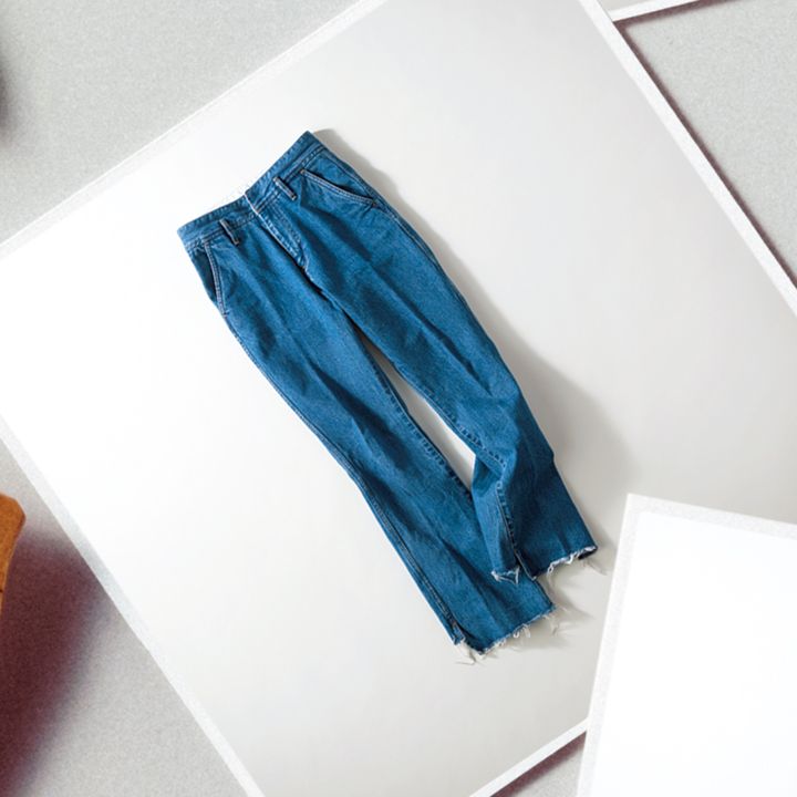 キレイなブルーが気になってすぐに試着。前の裾が長く後ろが短いデザインと程よいフレアシルエットで「めちゃくちゃ脚長に見える!」と感動。デニムを選ぶ際に美脚見えはあまり気にしていなかったけれどこれは即決でした。(スタイリスト/栗尾美月さん)