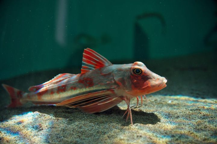 「ホウボウ」は、胸ビレが特徴的な魚で、羽根のように発達したものと、昆虫の足のような2つの構造に分かれています。 赤い体をしているうえに、青緑色に瑠璃色の縁取りがあるヒレをしており、とてもカラフルです!