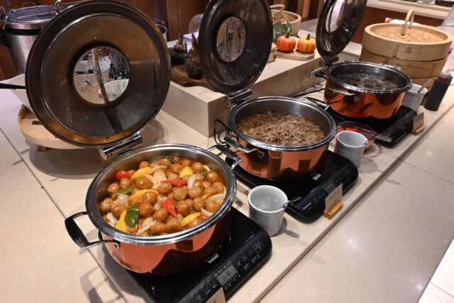 ▲五目ちまきや煮込み料理などが並ぶビュッフェ台