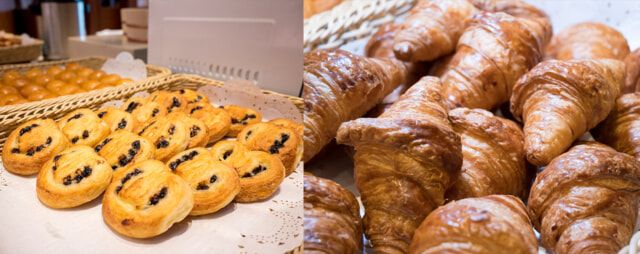 クロワッサンなどが並ぶパンコーナー。果肉がたっぷり入ったホテルの手作りジャムや、草津名産の花豆で作った自家製の “花豆バター” はイチ押しです。
