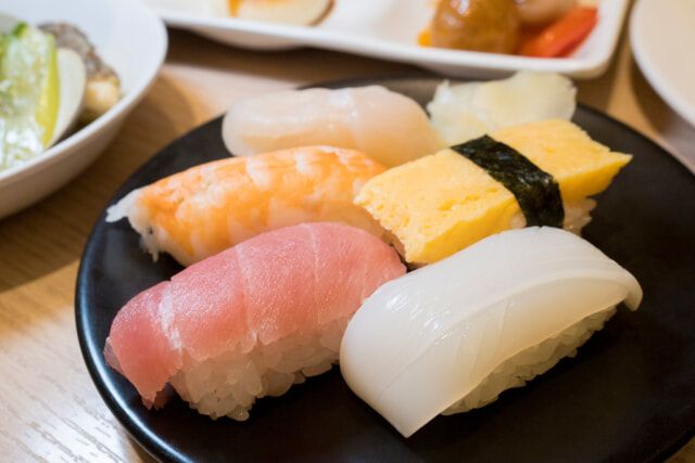 ビュッフェ台の一画には、握りずしのライブキッチンを用意。数種類のネタの中から、職人に好きな握りをオーダーします。この日のネタは「まぐろ」、「いか」、「えび」、「ほたて」、「たまご」で、昆布だし醤油やたまり醤油など3種類の醤油もそろえます。