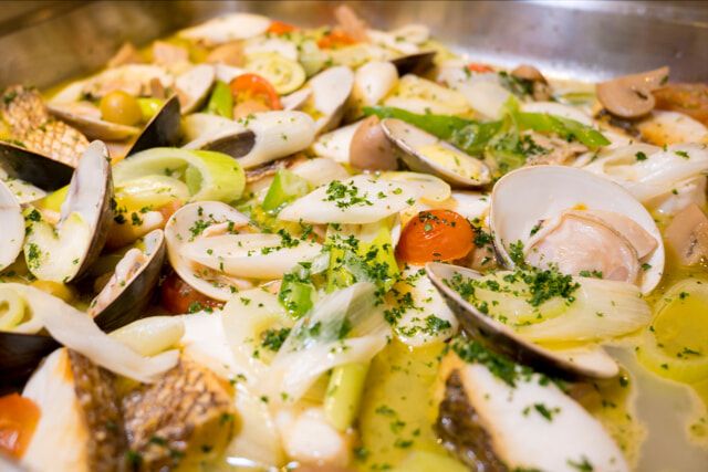 イタリア・ナポリの漁師の “まかない料理” が発祥と言われる「アクアパッツァ」は、鯛と蛤をニンニクで炒め、魚介の出汁と白ワインで煮込み、ネギやパセリで味に奥行きを加えます。春にだけ登場するメニューなので、もし出会ったら必食です。具材も多く魚介の旨味が口の中に広がります。