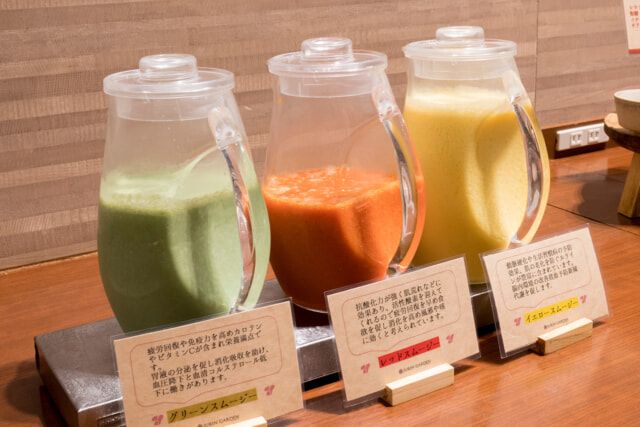 毎日3種類用意するスムージーは全て試しておきましょう。小松菜やバナナ、ヨーグルトを使った「グリーンスムージー」や、赤いパプリカとオレンジジュースを混ぜた「レッドスムージ」、パイナップルジュースと豆乳などで作った「イエロースムージー」と、どれも栄養たっぷりです。