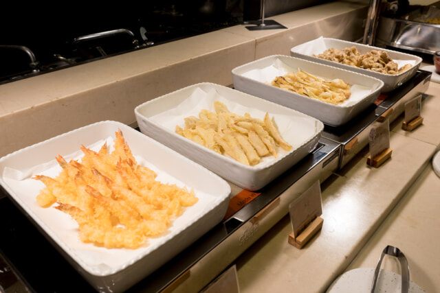 揚げたての天婦羅も注目です。この日は海老、うど、舞茸など4種類。特に、ホテルが特別に生産を依頼する根と芽が生えた “ひげにんにく” は、一般的なにんにくにくらべて実もふっくらしていて味もマイルド。近隣の吾妻地域で栽培された舞茸もいい味でした。