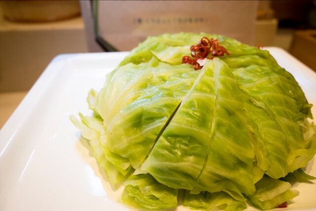 こちらもホテルの名物料理のひとつ「丸ごとキャベツ」。キャベツを丸ごと浅漬けにした逸品です。売店でも販売されている人気商品で、キャベツの優しい味わいを楽しめます。夏から秋にかけてはブランドキャベツとしても名高い「嬬恋キャベツ」も使われます。
