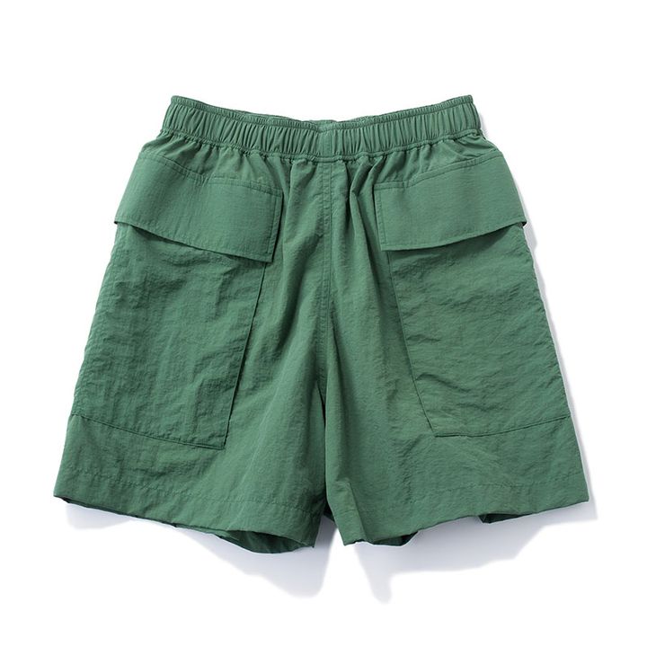 メンズブランド・Product Twelveとのコラボ。フロント〜バックにかかる大きなポケットがアクセントに、メッシュ裏地で肌離れが良く快適。グリーンショートパンツ¥26,400(フィーニー)