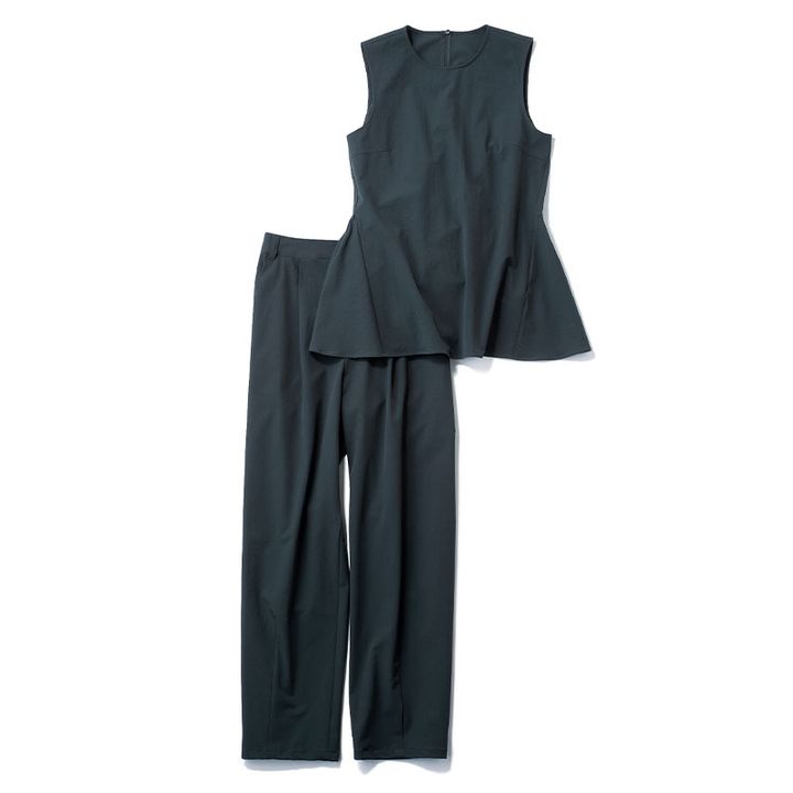 ラッシュガード素材だから水際もOK。写真映えもばっちりなペプラムで思い出も華やかに。トップス¥16,500パンツ¥23,100(ともにアルページュストーリー)