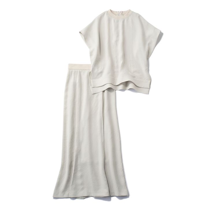 ナローなシルエットのサテンスカートで女っぽリラクシーに。トップス¥15,400スカート¥17,600(ともにエミ/エミニュウマン新宿店)