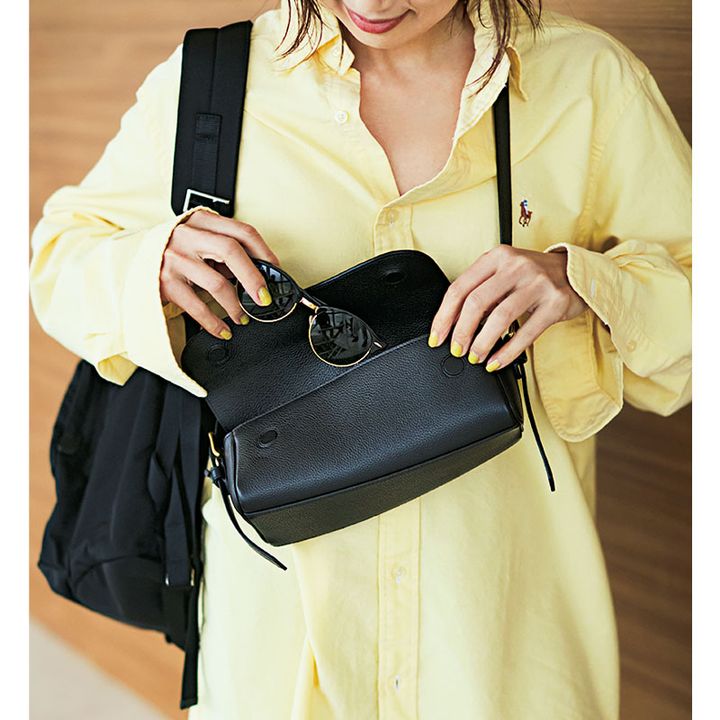 サングラス、サンスクリーンなど夏のお出かけの必需品の居場所を指定! バッグ¥181,500(アニヤ・ハインドマーチ/アニヤ・ハインドマーチジャパン)ロングスリーブT¥19,800(サードマガジン)スエットパンツ¥17,600(ジャーナル スタンダード ラックス/ジャーナル スタンダード ラックス 表参道店)ピアス¥35,200(ete bijoux/エテ)サングラス¥47,410(オリバーピープルズ/ルックスオティカジャパン カスタマーサービス)