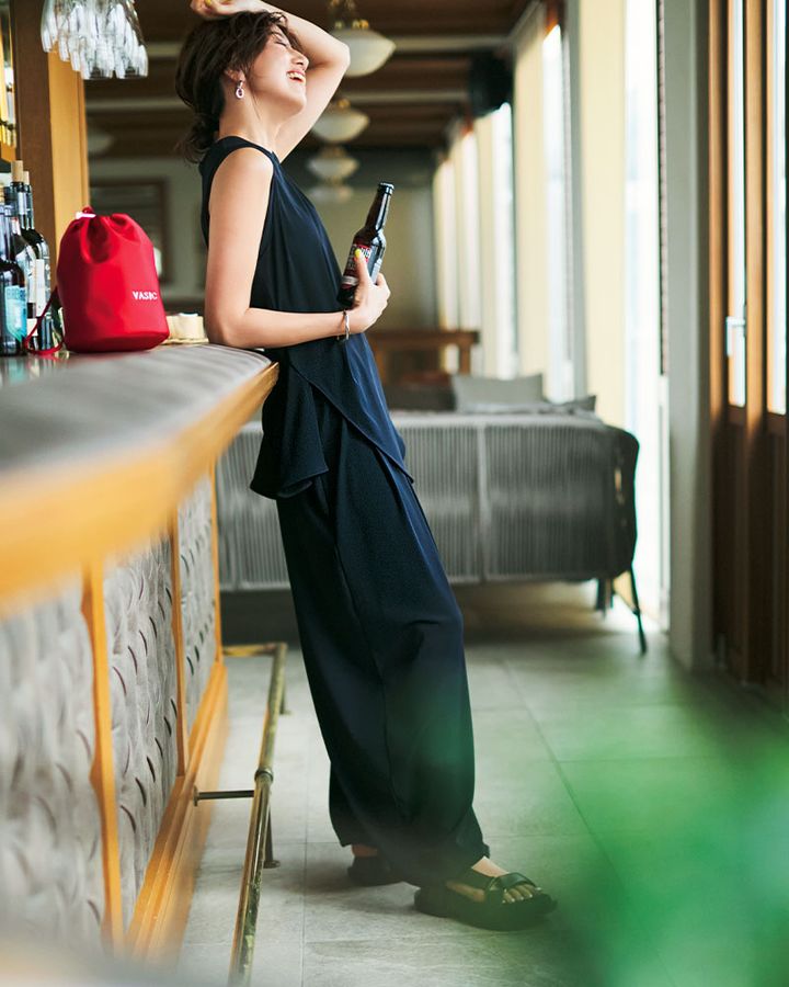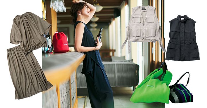 コーデで悩みたくない早朝出発はセットアップにお任せ。水着素材なので水際やゲリラ豪雨も余裕綽々、モードなバルーンシルエットで大人なTPOも難なくクリア。ノースリーブトップス¥18,700バルーンパンツ¥20,900(ともにナゴンスタンス)バッグ¥19,800(ヴァジック/ヴァジックジャパン)サンダル¥49,500(サクラ/インターリブ)ピアス¥12,960(アビステ)バングル¥4,840(トゥデイフル/ライフズ 代官山店)