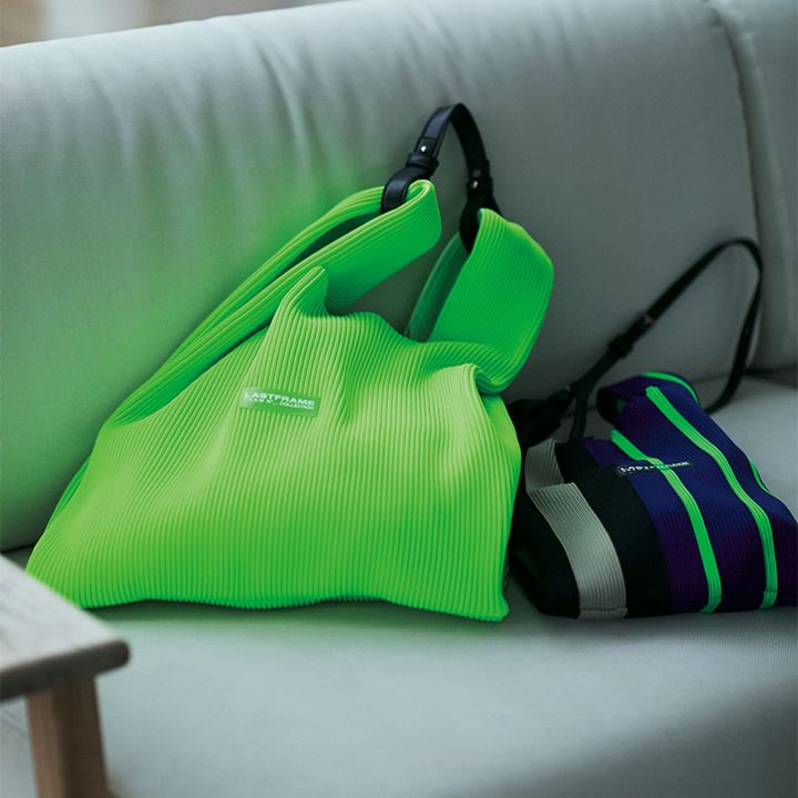 国内でも希少な織り機で編み上げたリブニット素材で、横に伸びて荷物がたくさん入るのに縦伸びはしないから型崩れしにくく美シルエットをキープ。レザーストラップで肩掛けにも。グリーンバッグ[H37.5×W37×D1cm]¥38,500ストライプバッグ[H32.5×W23×D1cm]¥34,100(ともにラストフレーム/タカ)