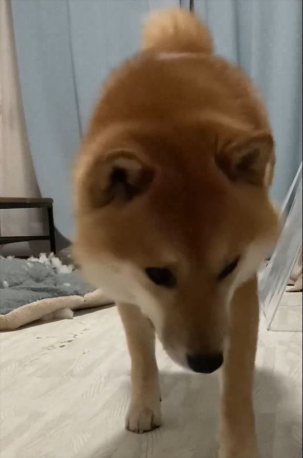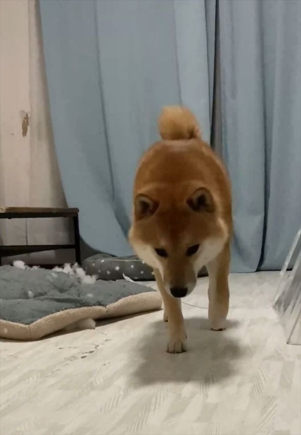 クッションからワタを出して遊んでいたという柴犬。 ところが、飼い主さんに呼ばれるとイタズラがバレたことに気が付いたようです。 歩いてくるその姿には、気まずさが漂っていました。