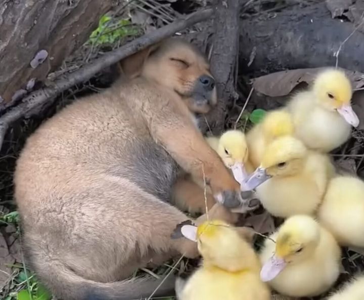眠くてたまらない子犬さん。アヒルちゃんに見守られながらスヤスヤ。