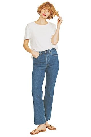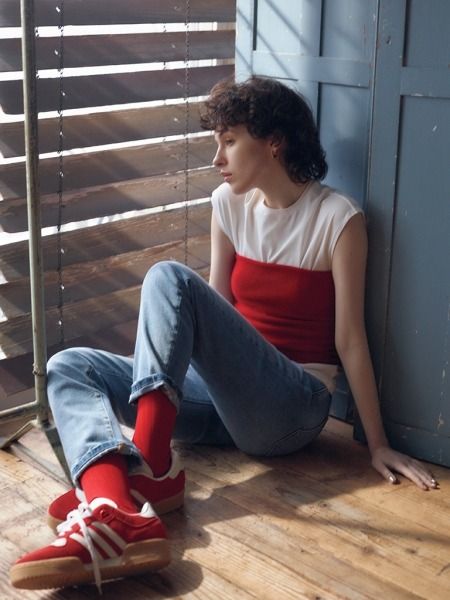 白スリーブTシャツ 16,500円/THE NEWHOUSE(アーク インク) デニムパンツ 36,300円/DIESEL(DIESEL JAPAN) 赤ニットビスチェ 30,800円/エクストリームカシミヤ(アルアバイル) ゴールドピアス 16,500円/Jouete 赤靴下 2,640円/HOiSUM 赤スニーカー 15,400円/adidas(アディダスお客様窓口)