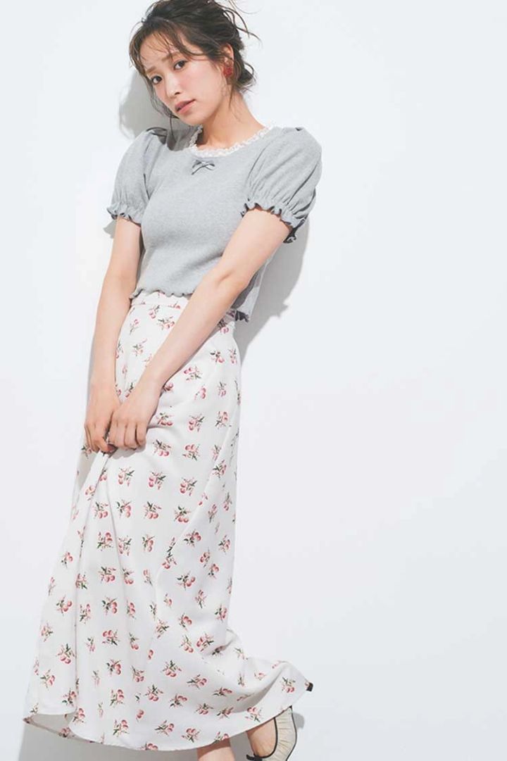 パフスリTシャツ 3,299円/PHILLY スカート 23,100円/DEICY(DEICY ルミネ新宿店) イヤリング 4,320円/アビステ 靴 8,910円/RANDA