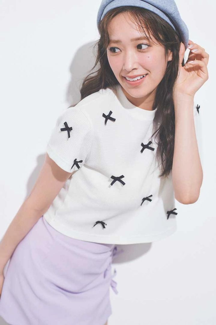 ラフな印象のワッフル素材Tシャツも、お上品な黒のちびリボンを盛ることでガーリーにアップデート!