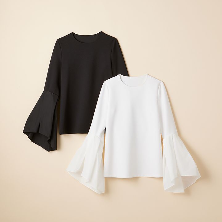 バランスのいい甘さが持ち味のランバン オン ブルーでは、袖コンシャスなカットソーアイテムが揃います。右は袖がバルーンシルエットになっており二の腕をカバーしつつ洒落感をプラス。着るだけで「手をかけている感」がゲットできます。左のロンTはフレア袖がドラマチックに動き、エレガントな印象に。カットソー【左から】¥15,400 ¥25,300(ともにLANVIN en Bleu)
