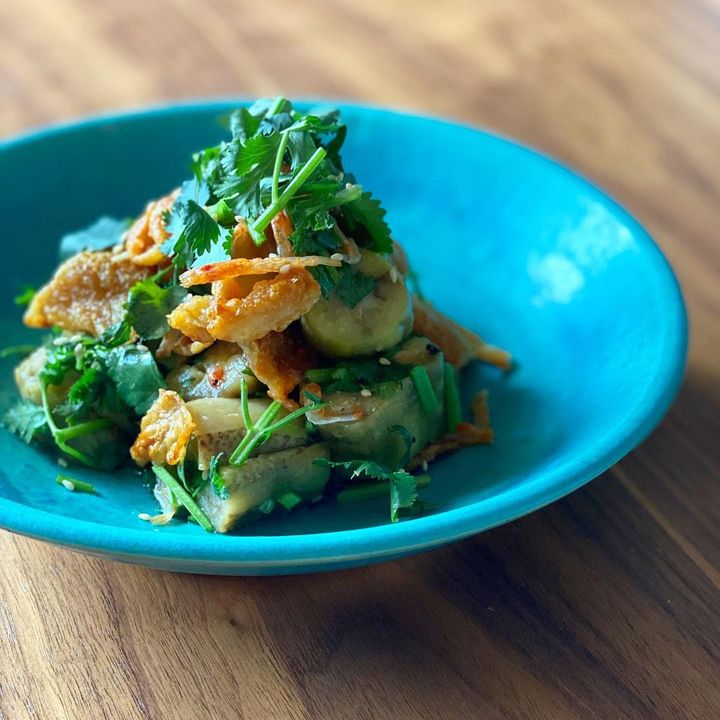 グリルで黒くなるまで焼いて皮をむいた焼きなすに、パリッと焼いた鶏皮と刻んだパクチー、干し海老を合わせて。