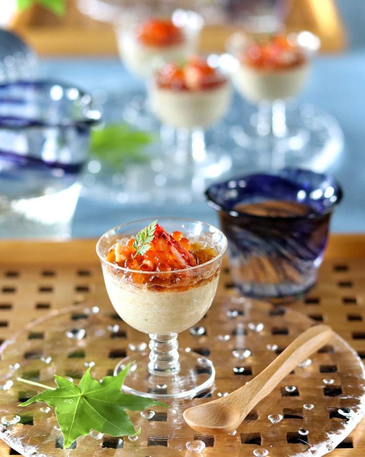 かにといくらのジュレをあしらった、特別感あふれる焼きなすのムース。